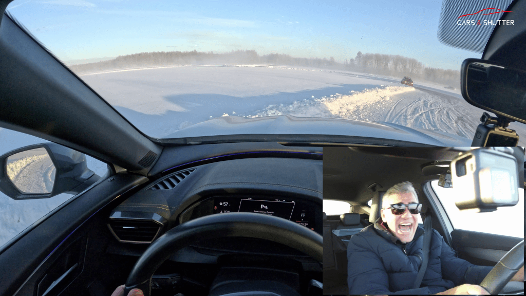 Now it was time to go driving on ice … Kind of like learning to dance with nature’s most slippery and unpredictable and uncontrollable surface, at least with non-studded tires. I tested my Formentor in 3 main driving stints, and each time around 10 to 12 mins. This was in between setting up cameras, shooting action shots, taking some time to enjoy the cars, and running around with the DJI Osmo Pocket in my hand ! My aim was to learn and I was only going speeds of 30 km/h, I found myself confronting the unforgiving ice wall—head-on and sideways but luckily the car behind me was much further and I also didn’t crash into the icy snow barrier! Each encounter was a crash course in physics and pure giggly sensations, turning my car around in a dramatic 180-degree spin on one occasion.